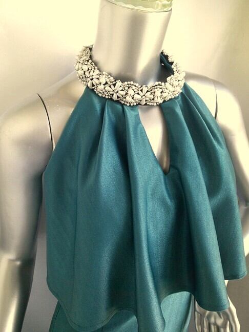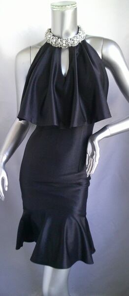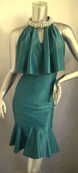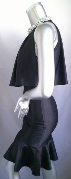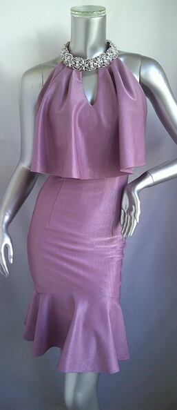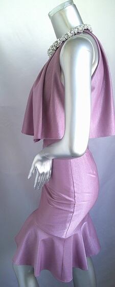 上品な光沢のラメニット生地で作ったマーメイドワンピースドレス。首周りの豪華なビジューがポイントです。だれでもスタイル良く見せてくれるシルエットとほどよいストレッチで、気になる部分もカバー。ひざ丈なのもうれしい1枚です。