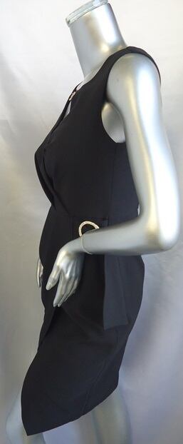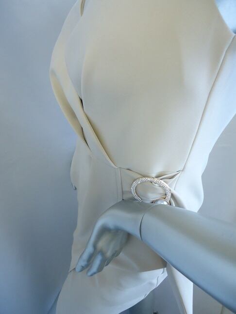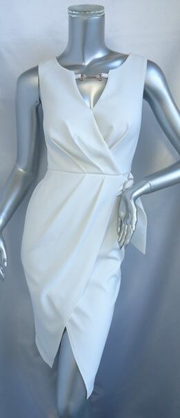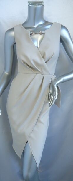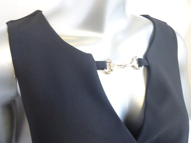 美しいV衿のラップ巻き風ワンピース。スカート重ねは見せかけで、下前側が脇に縫い込まれていますので座った時、はだけにくくなっています。後ろコンシールファスナーで脱着するので簡単で安心です。人気の胸元ミニバックル付き。
