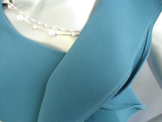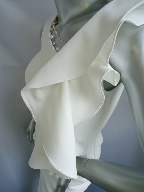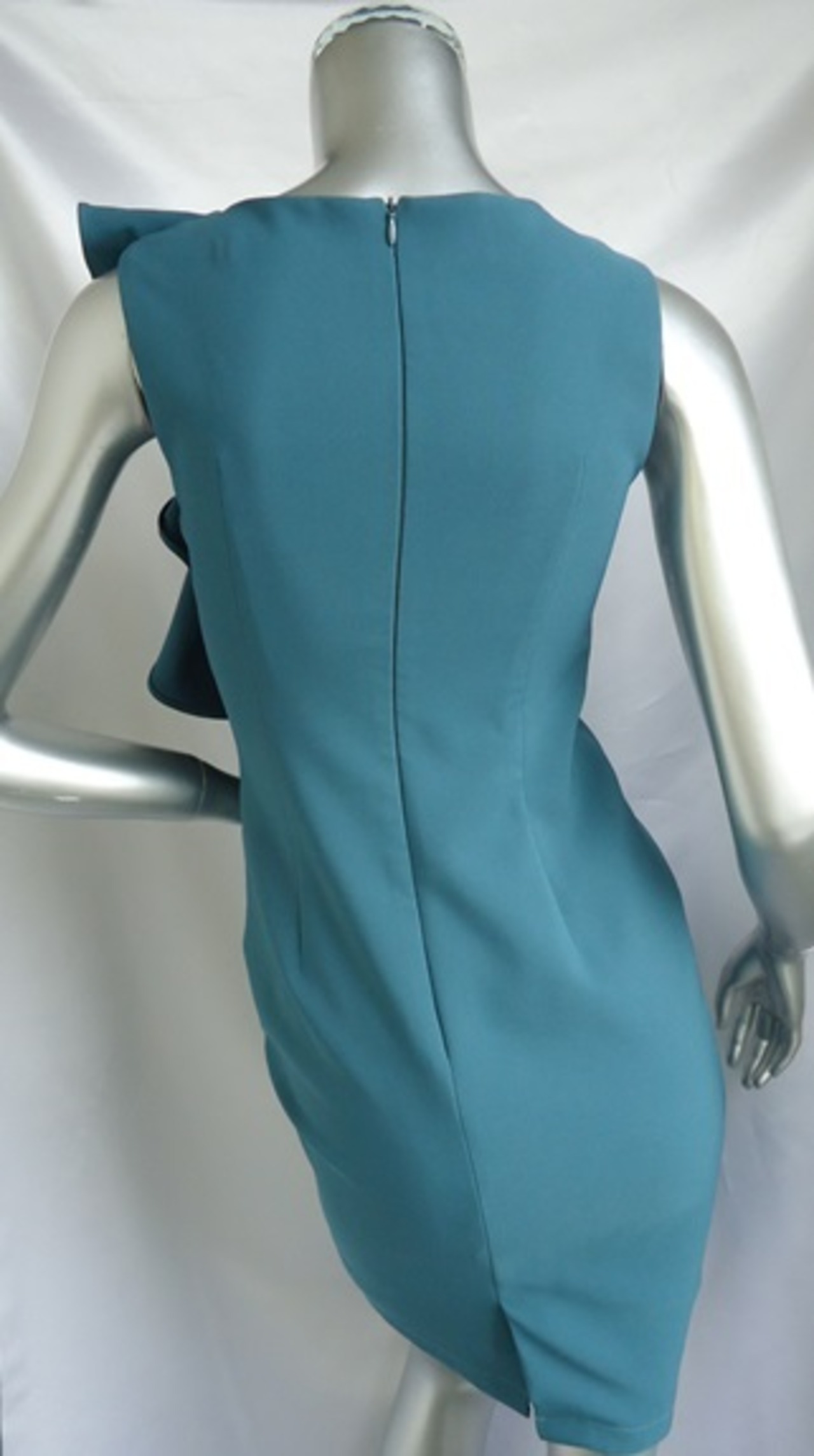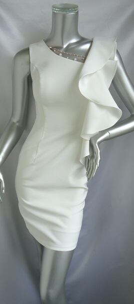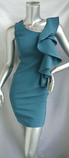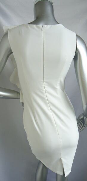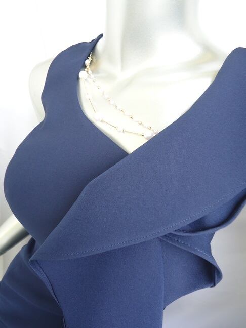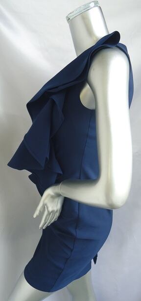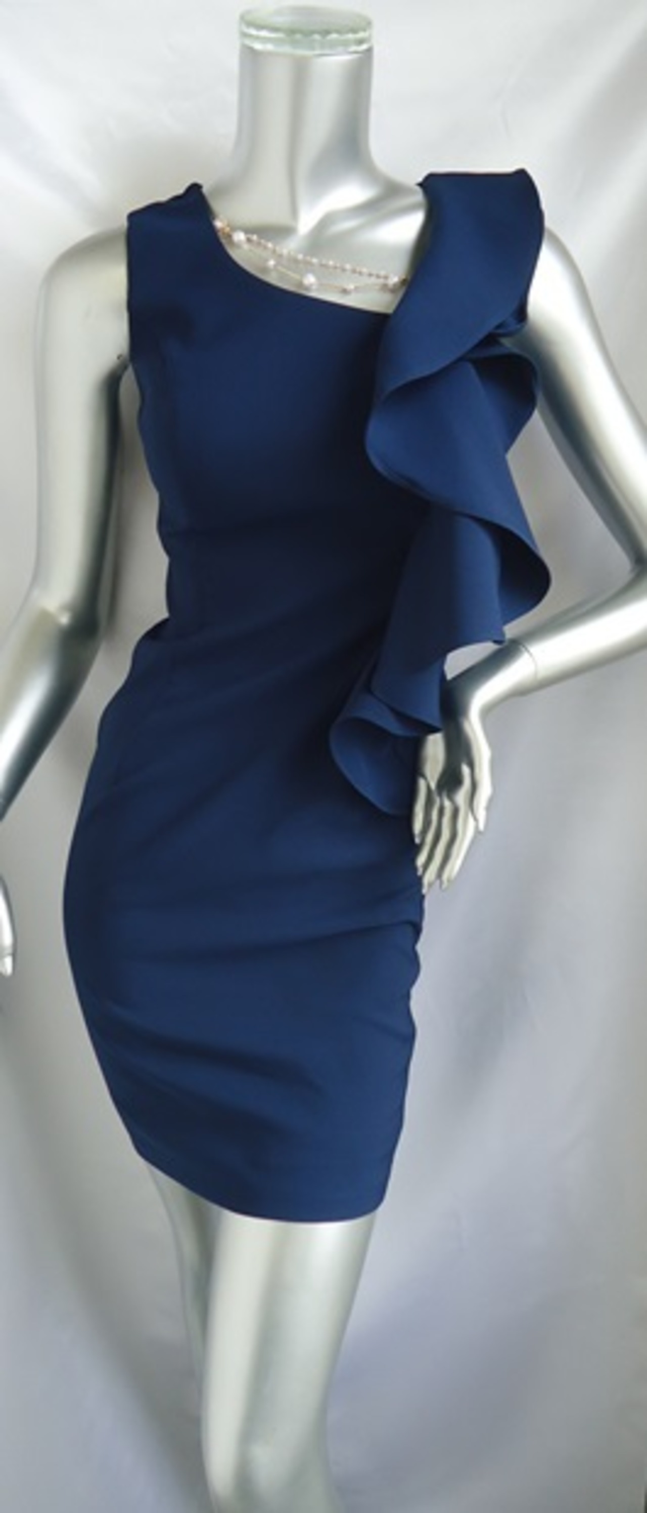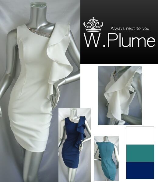 左肩から流れるようなフリルがゴージャス!衿ぐりもアシンメトリーになっており、合わせたチェーンが素敵です。短すぎないスカート丈なので結婚式やパーティまで、いろいろなシーンに使えるワンピースです。多少ストレッチあり。